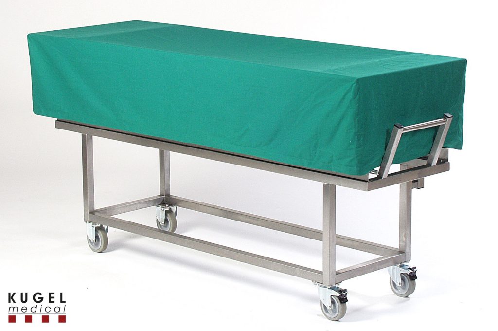 Dieser Transportwagen wird überwiegend zum Transport von Verstorbenen innerhalb des Krankenhauses verwendet. Durch das grüne OP-Abdecktuch ist dieser Transportwagen nicht sofort als Leichentransportwagen erkennbar. Die Stabile verwindungssteife Rahmenkonstruktion ist komplett aus Edelstahl (Material Nr. 1.4301 – ANSI 304) gefertigt. Der Transportwagen ist mit 4 Lenkräder, 2 Stück feststellbar, 2 Stück mit Richtungsfeststeller d = 125 mm mit Spezialkugellager, dauergeschmiert und wartungsfrei, ausgestattet. Der Oberaufbau ist mit einer Rollbahn aus Edelstahl mit 5 Tragrollen sowie Haltevorrichtung für Leichenmulde versehen. Der Schiebebügel ist fest angeschweißt. Oben ist ein seitlich kippbarer Rahmenaufbau mit automatischer Kippbegrenzung zur Aufnahme des Abdecktuches angebracht. Im Lieferumfang ist ein abnehmbares Abdecktuch aus grünem Bauwollstoff (wasch- und sterilisierbar) enthalten. (Alternativ ist auch eine Abdeckung aus PVC lieferbar)
