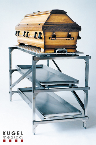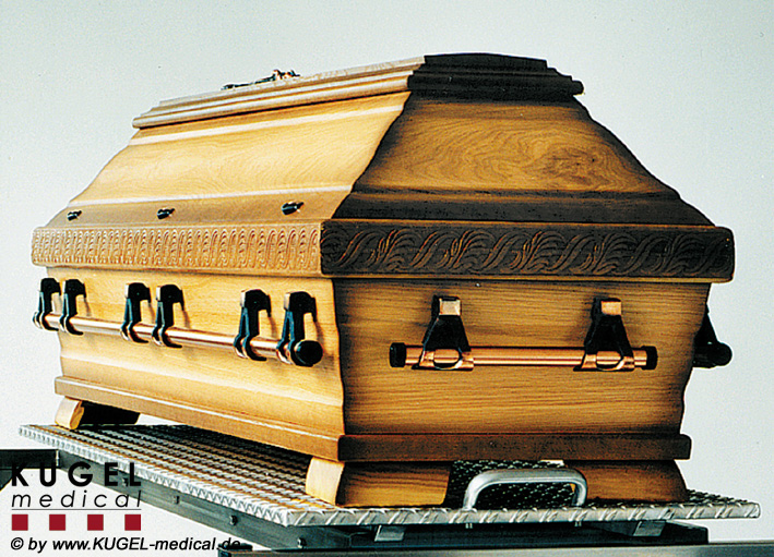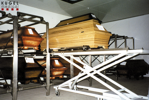 Zur Aufnahme von Särgen mit unterschiedlichen Größen und Ausführungen. Der Sarg bleibt während des gesamten Lagerzeitraumes auf der Sargplatte stehen. Ein mehrmaliges Umsetzen ist dadurch nicht erforderlich. Eine stabile Konstruktion aus einer wasserfesten Mehrschichtverbundplatte mit Melaminharzbeschichtung und angerauter Oberfläche mit 2 Kufen an der Unterseite gewährleisten einen geräuschfreien Transport und verhindern zusätzlich ein seitliches Verkanten der Sargplatte. An einer Stirnseite ist ein Schiebegriff angebracht .