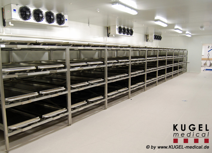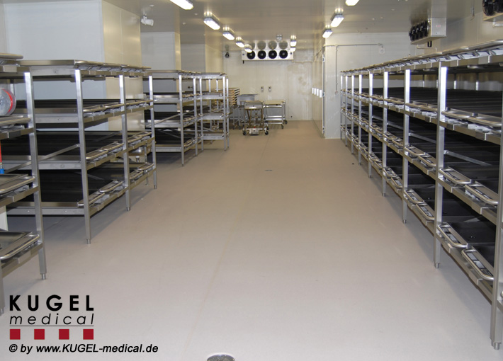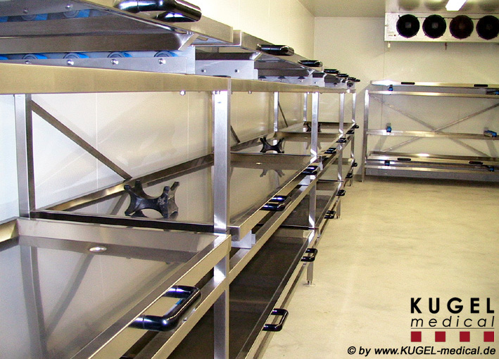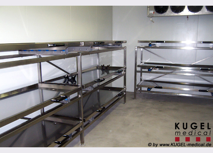 Die stabile selbsttragende Rahmenkonstruktion ist aus verwindungssteifen Edelstahlprofilen mit 2 Diagonalversteifungen zur optimalen Standfestigkeit gefertigt. Die Regaleinrichtung ist pro Ebene mit einer Rollbahn aus Edelstahlwinkelprofilen mit je 5 Tragrollen aus korrosionsfestem Material mit Kunststoffüberzug und wartungsfreien Kugellagern, sowie je einer Stoppvorrichtung ausgestattet. Die Breite der Regale und die Einzelfachhöhen sind variabel und werden entsprechend den Kundenanforderungen angepasst. Das Regal wird in Einzelteilen angeliefert, kann frei aufgestellt werden und muss nicht am Boden oder der Wand befestigt werden. Verschiedene Modelle siehe Datenblatt.