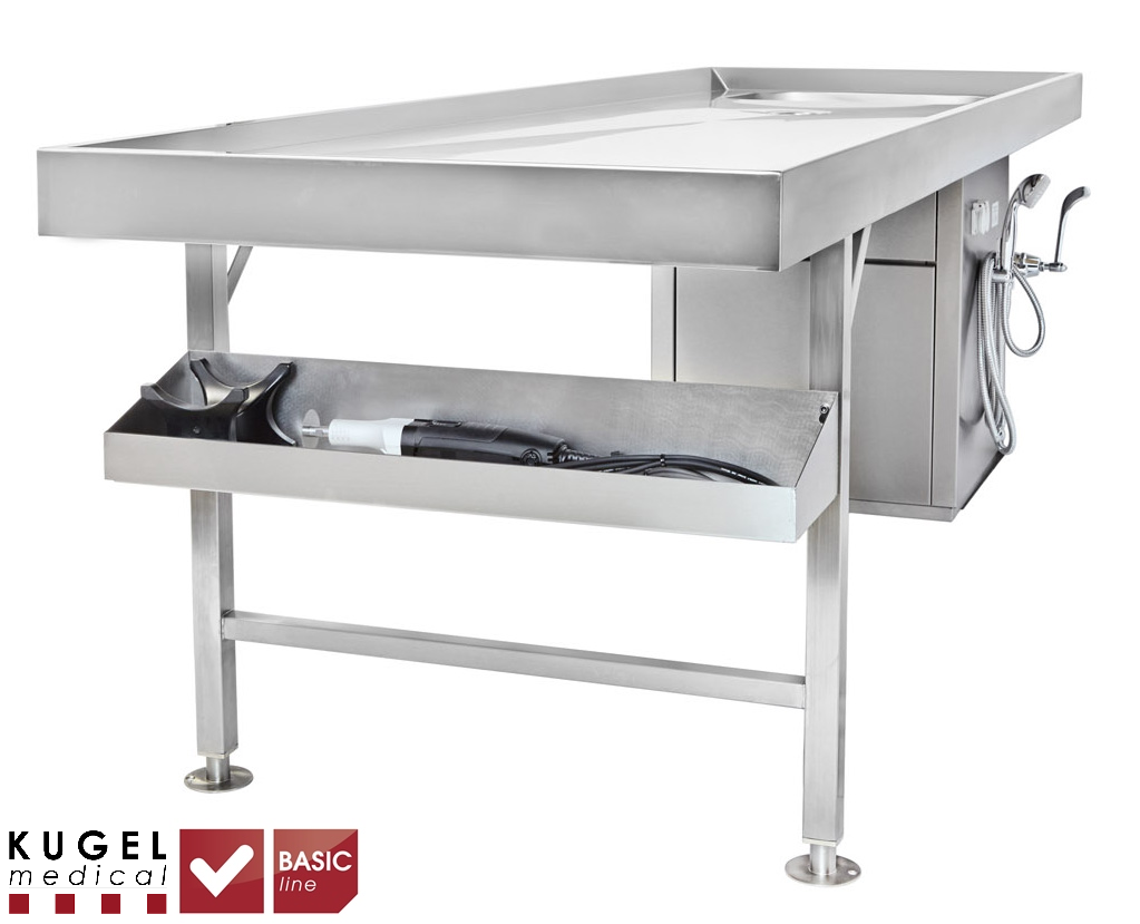Unsere neue BASIC line wurde mit dem Ziel Diagnostik, medizinische Standards und Behandlungen in Afrika und anderen Kontinenten mit mangelnder medizinischer Grundausstattung und –versorgung zu verbessern, geschaffen. Die BASIC line charakterisiert sich durch einfache und zuverlässige Lösungen zu vernünftigen Preisen ohne dabei die weltweit geschätzte KUGEL medical Qualität unserer Produkte MADE IN GERMANY zu mindern. Der Seziertisch ST 10/350 steht auf einer Installationssäule sowie auf einem Abstützfuß mit Höhenverstellung. Der Tisch ist komplett aus Edelstahl (Material Nr. 1.4301 – ANSI 304) gefertigt. Die Auflagefläche ist mit einem hohen umlaufenden Profilrand und einem nahtlos eingearbeiteten Organbecken 400 x 500 x 200 mm mit Standrohrventil versehen. Die Tischplatte hat eine diagonale Prägung und ein Gefälle zum Ablauf hin. Der Ablauf der Auflagefläche ist mit dem Ablauf des Beckens verbunden. Die Medienanschlüsse liegen innerhalb der Mittelsäule und sind über eine Revisionsöffnung jederzeit gut erreichbar. Der Seziertisch ST 10/350 enthält folgende Merkmale: Alle Lösungen des BASIC line Sortiments sind mit dem BASIC line-Logo gekennzeichnet.