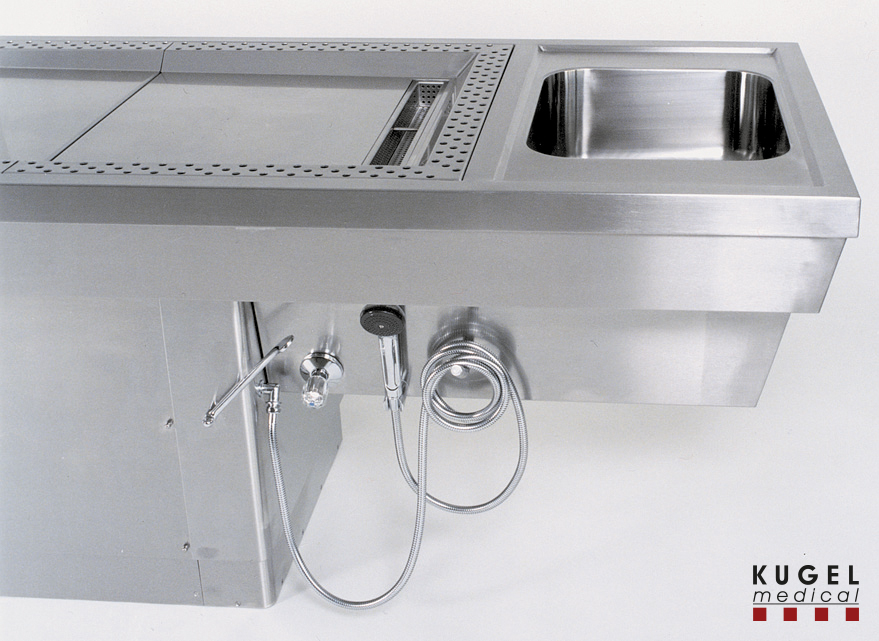 Seziertisch auf Mittelsäule drehbar nach links und rechts um je 180°, höhenverstellbar von 750 – 1000 mm. Seziertisch komplett aus Edelstahl (Werkstoff Nr. 1.4301) gefertigt. Über eine 3-teilige, herausnehmbare, perforierte Auflagefläche werden alle gesundheitsschädlichen Gerüche sicher nach unten abgesaugt. Ein nahtlos eingeschweißtes Organbecken (400 x 500 x 200 mm) mit umlaufendem Profilrand ist am Tischende angebracht. Wasserfeste Antidröhnunterleimung der Tischplatte. Unterseite komplett geschlossen. Mittelsäule mit Revisionsöffnung. Alle Versorgungsmedien verlaufen innerhalb der Mittelsäule. Über ein integriertes Sprinklersystem ist eine permanente Reinigung des Tisches gewährleistet. Alle Energieanschlüsse sowie der Abluftanschluss sind innerhalb des Sockels eingebaut. Der Tisch ist an eine bauseitige Abluftanlage anzuschließen, Abluftmenge min. 1000 m³/h. Der Seziertisch STV 10/100 enthält folgende Merkmale: