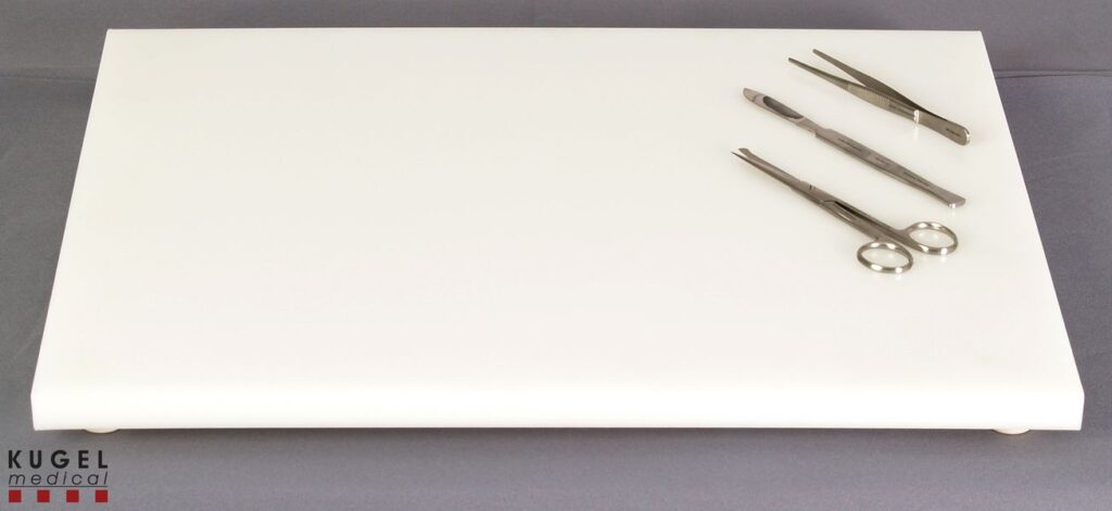 Das Schneidebrett ist komplett aus Polyethylen gefertigt. Die Plattenstärke beträgt ca. 20 mm. Unten sind 4 Füße mit einem Durchmesser von 25 mm und einer Höhe von 20 mm angebracht. Das Schneidebrett ist nicht für thermische Sterilisation geeignet.